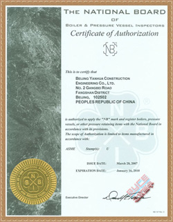 certified for Authorization of ASME ¡°U¡± Stamp issued by ASME, and is capable
